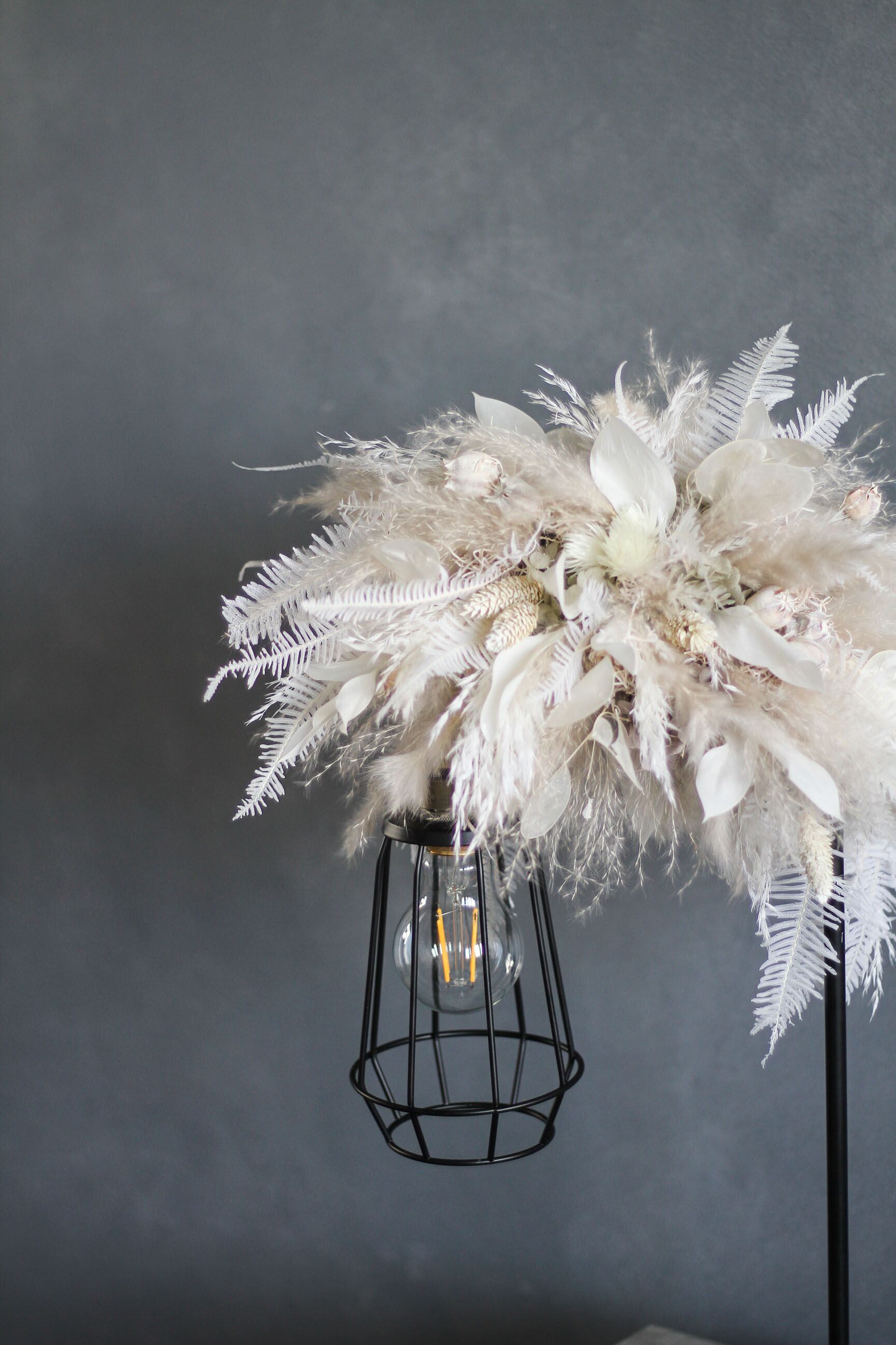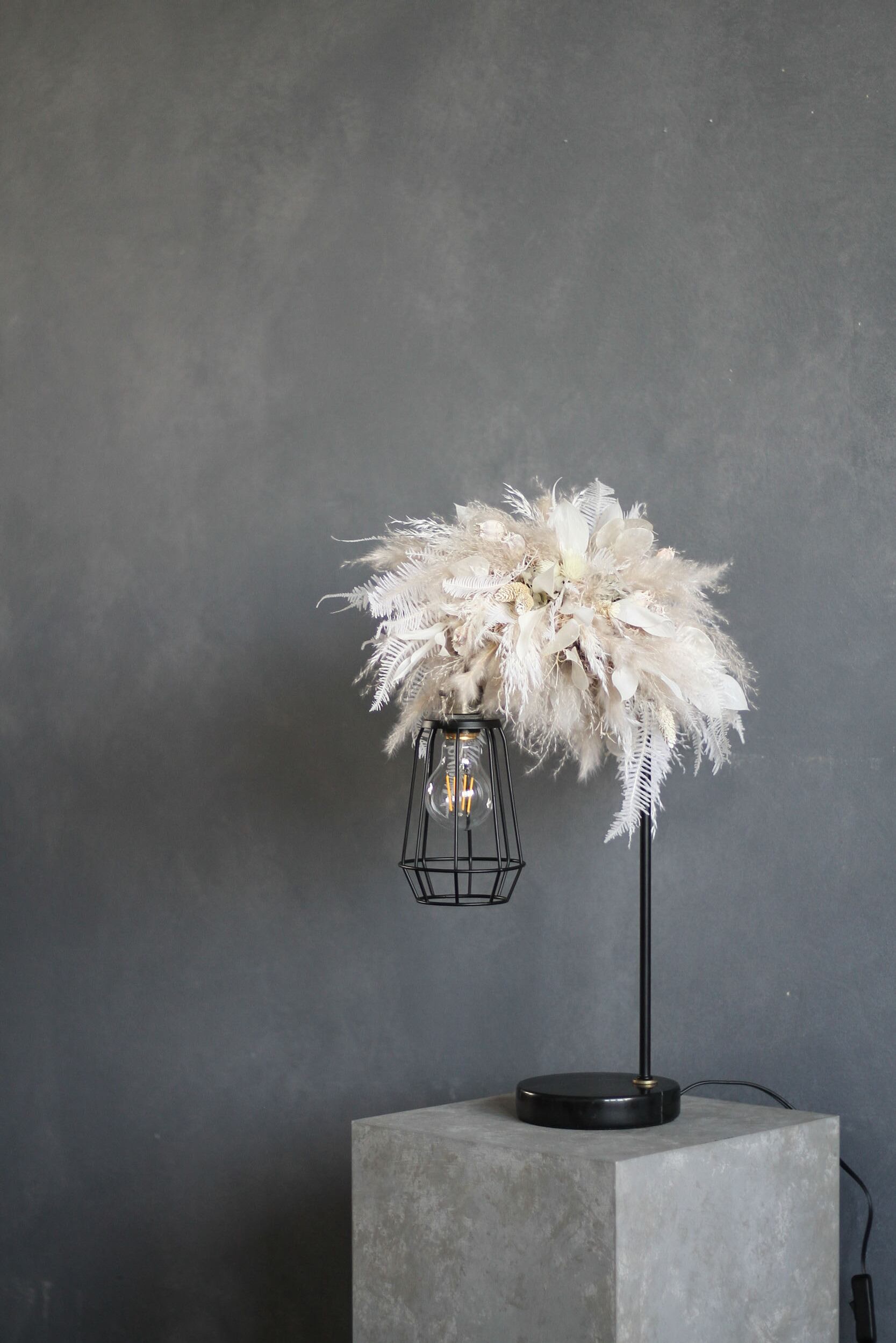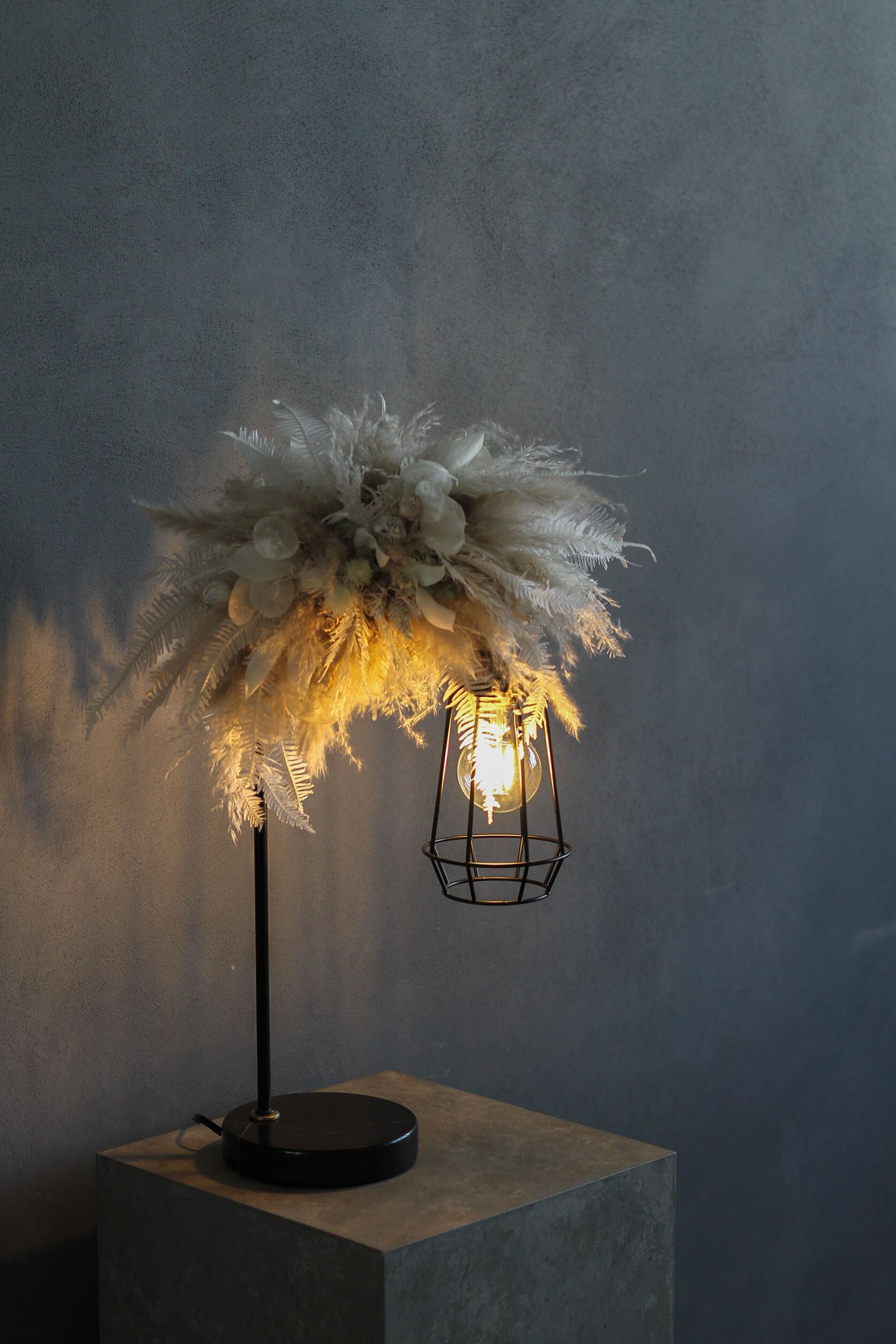 重厚感のあるスタンドランプにたっぷりのドライフラワーをアレンジしたコンセント式のペンタゴンランプ。