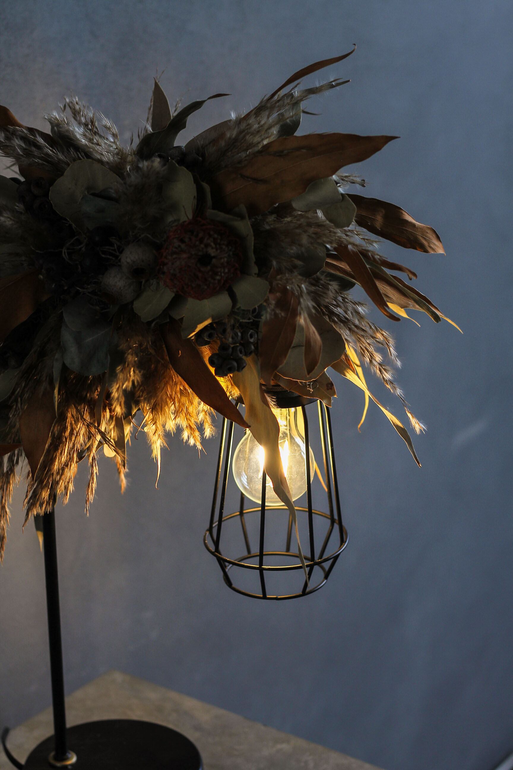 重厚感のあるスタンドランプにたっぷりのドライフラワーをアレンジしたコンセント式のペンタゴンランプ。