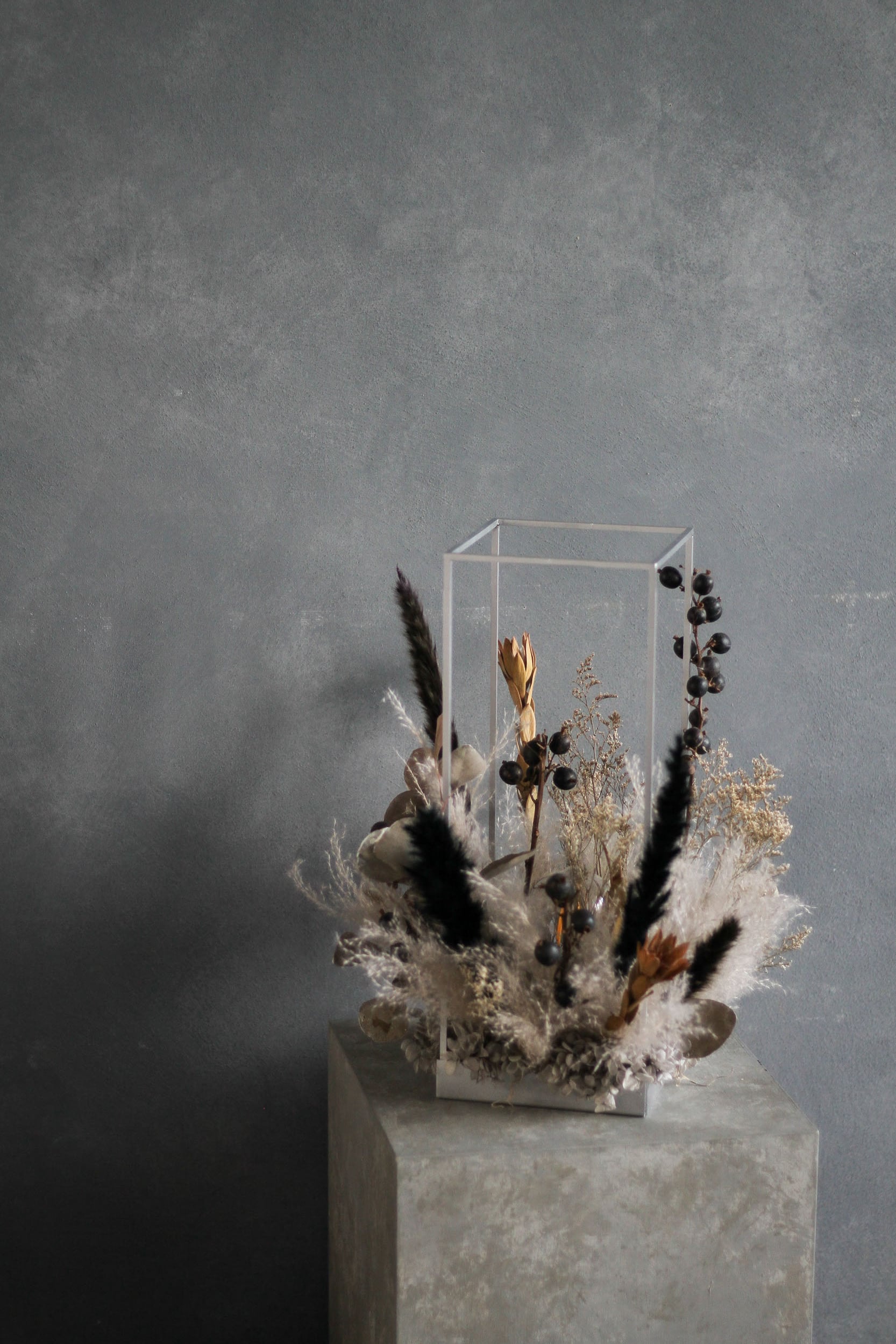 スクエア型フレームにドライフラワーをアレンジした置き型シャンデリア「スクエア」。