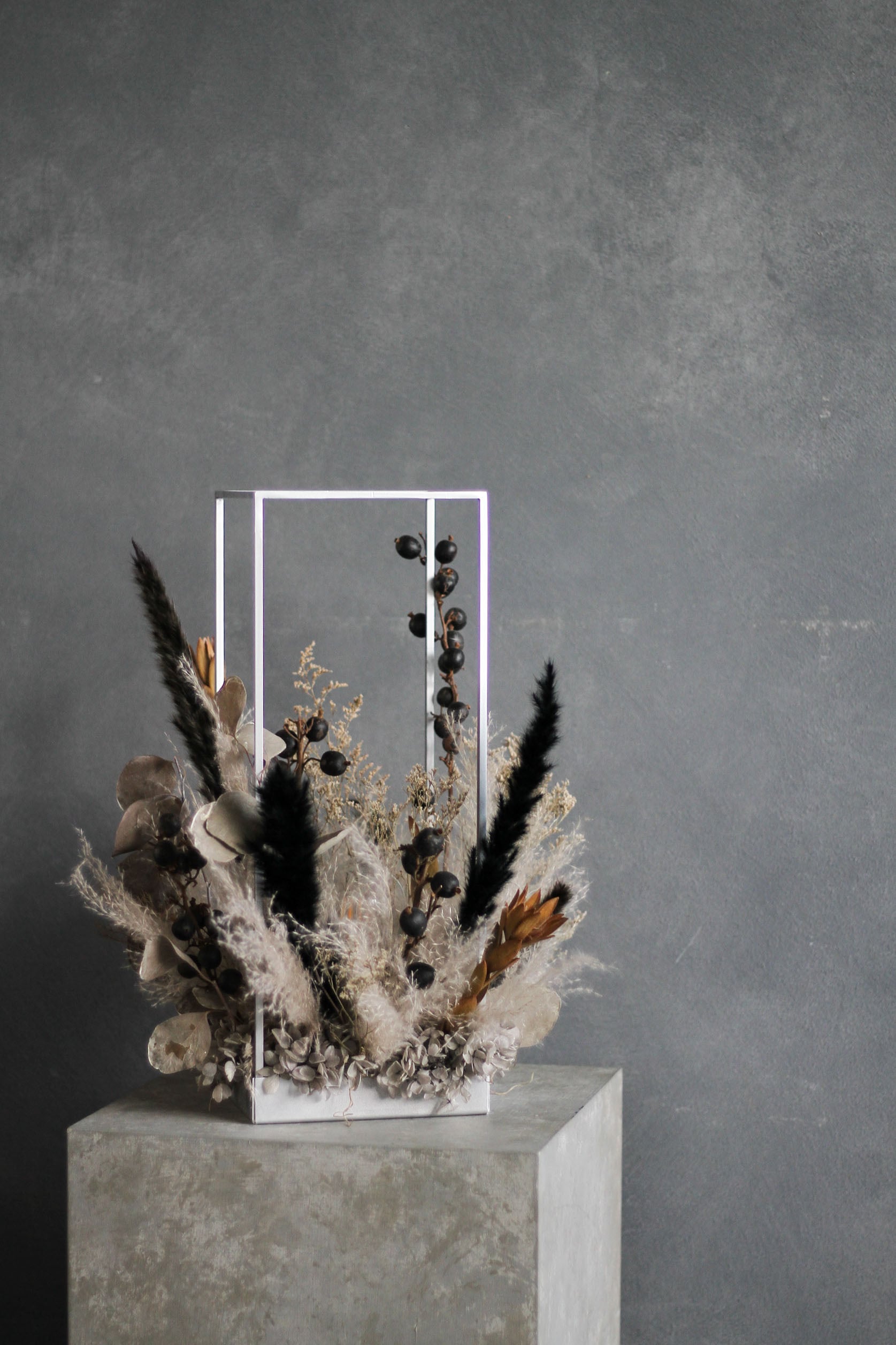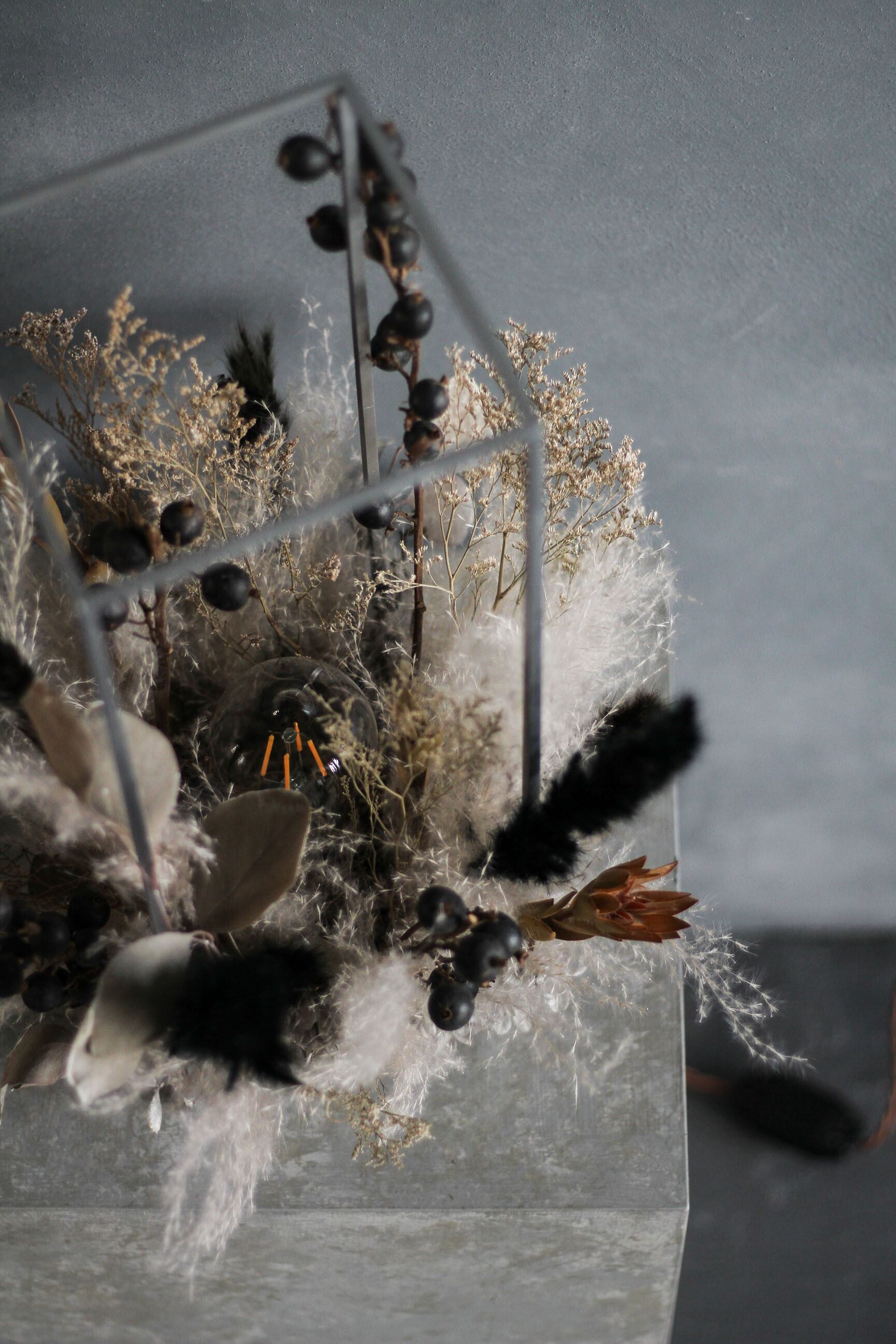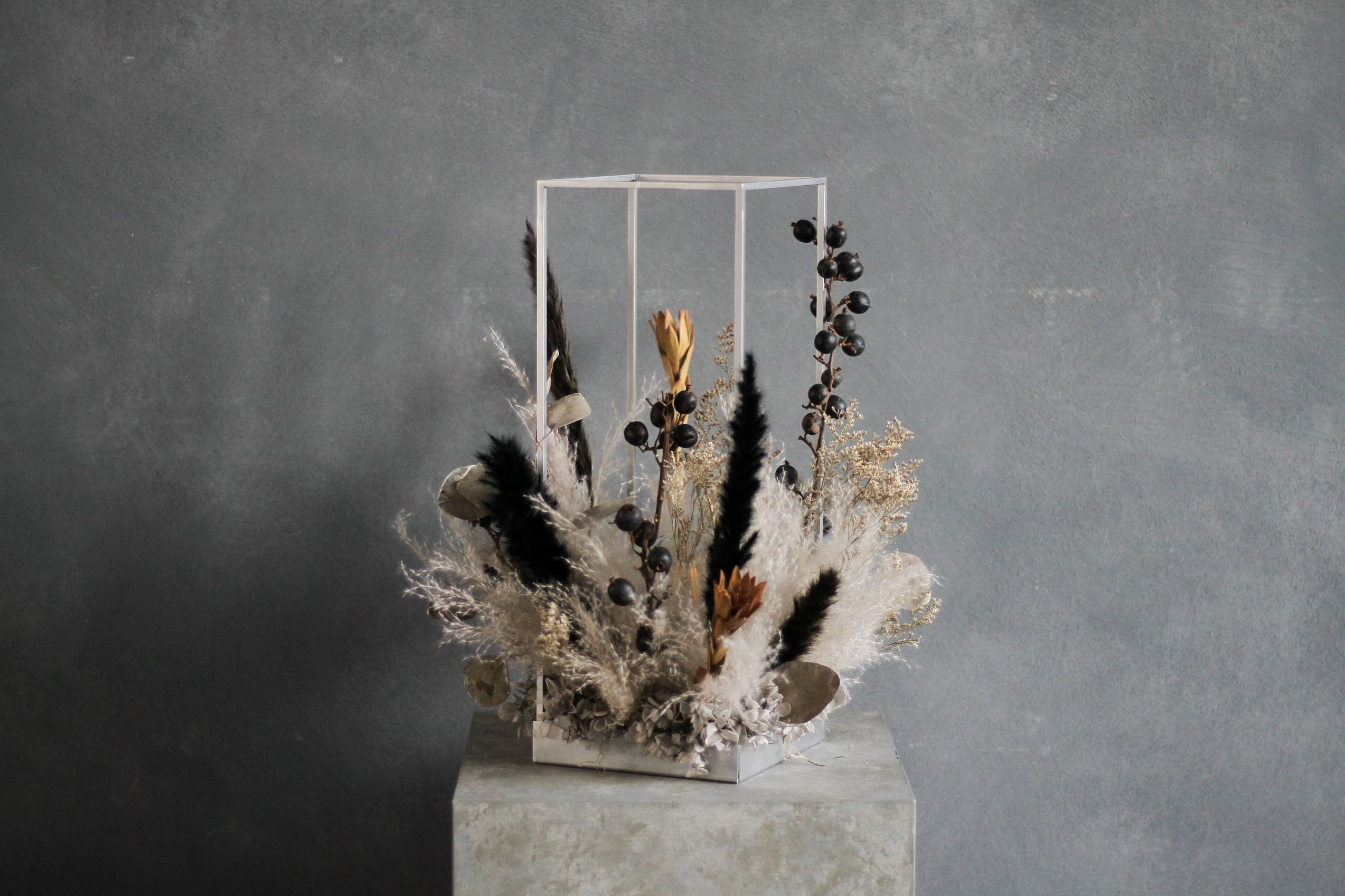 ぽわっと柔らかなグレーの花材にピリッと締め色のブラックを組み合わせ、クールな印象を演出しています。