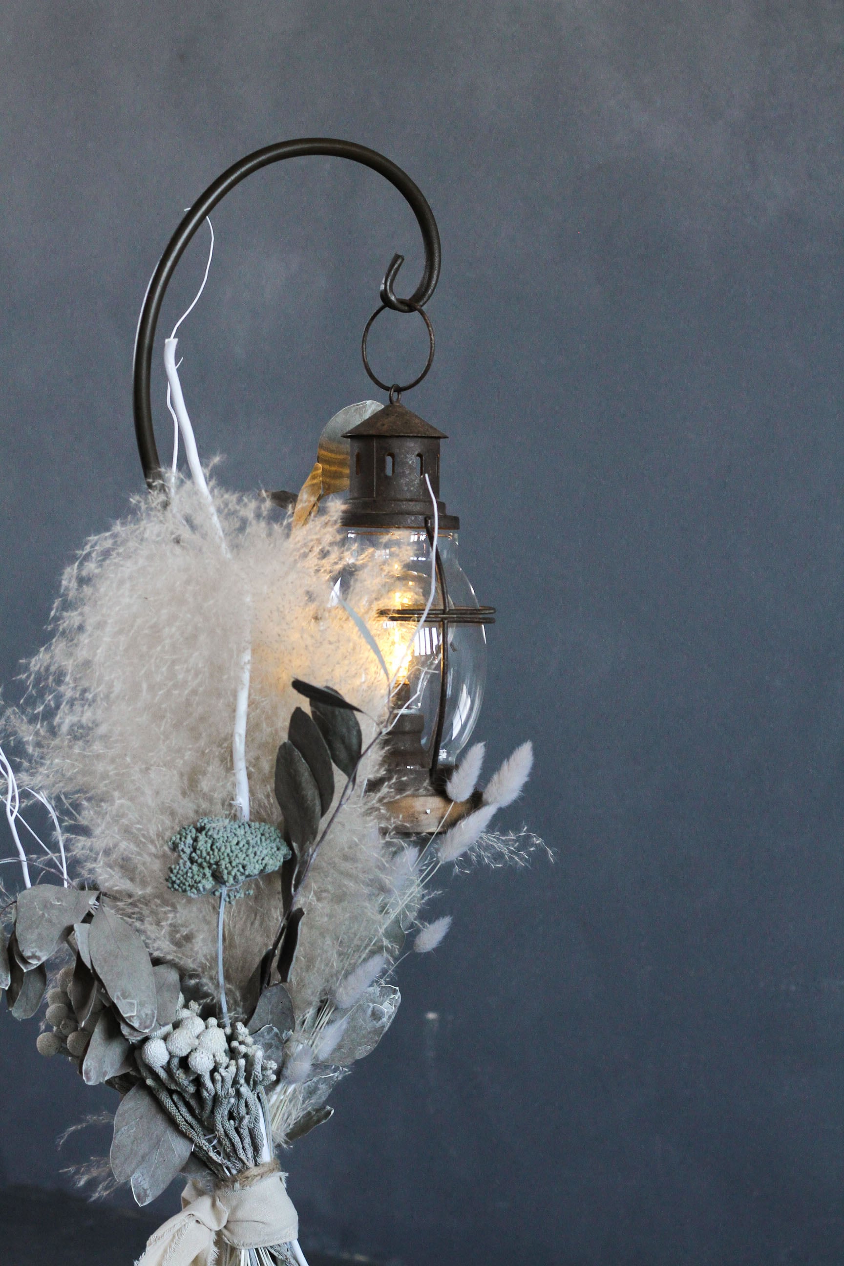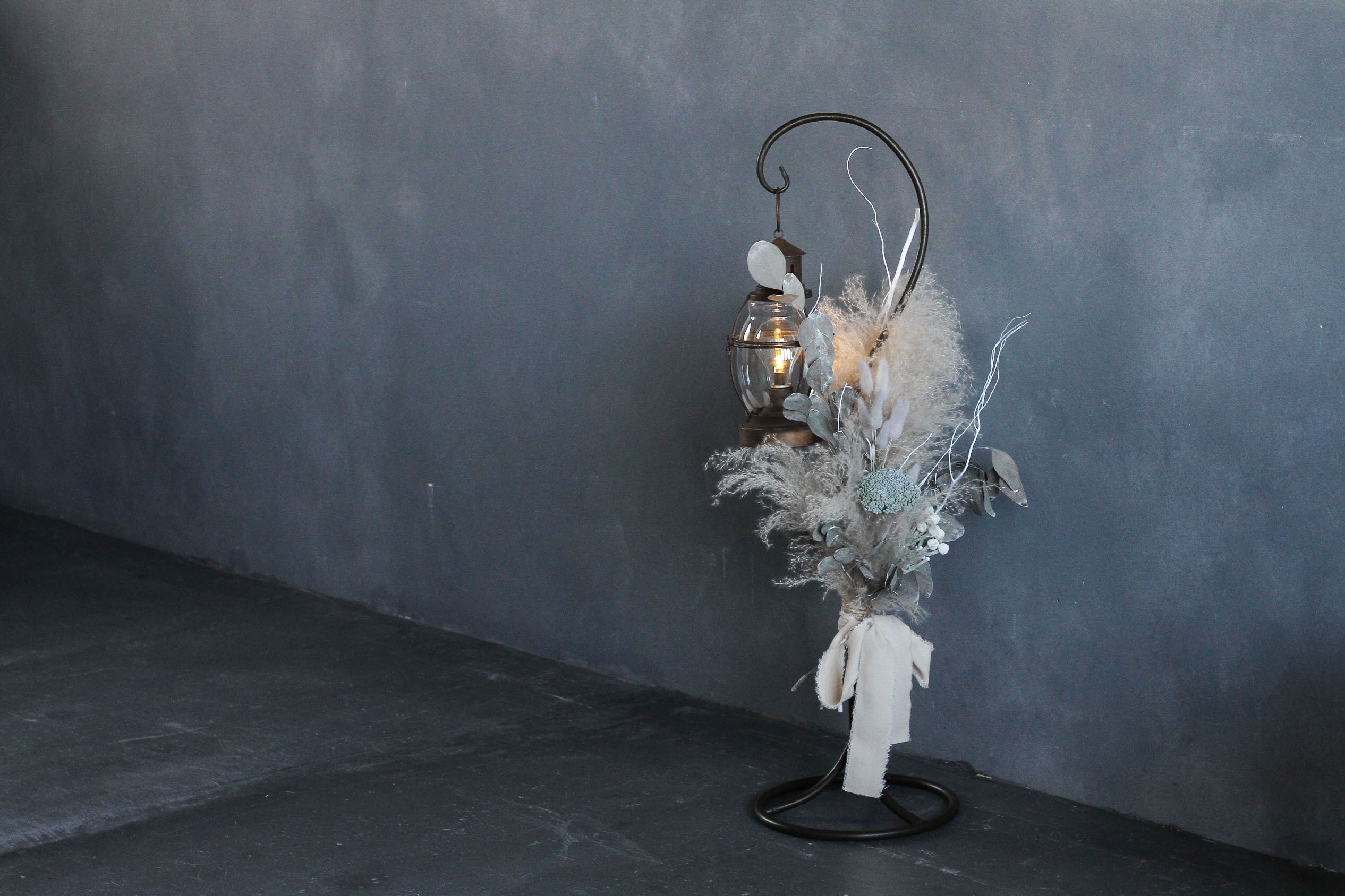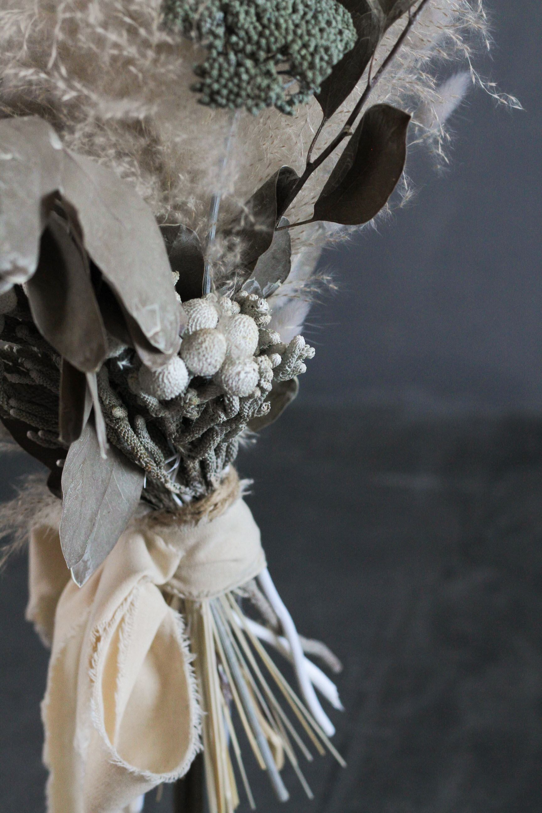 ふわふわのビックテールリードをベースに、アキレア・シルバーブルニア・ポプルスユーカリなどナチュラルな花材を組み合わせたシックなデザインに仕上がっています。