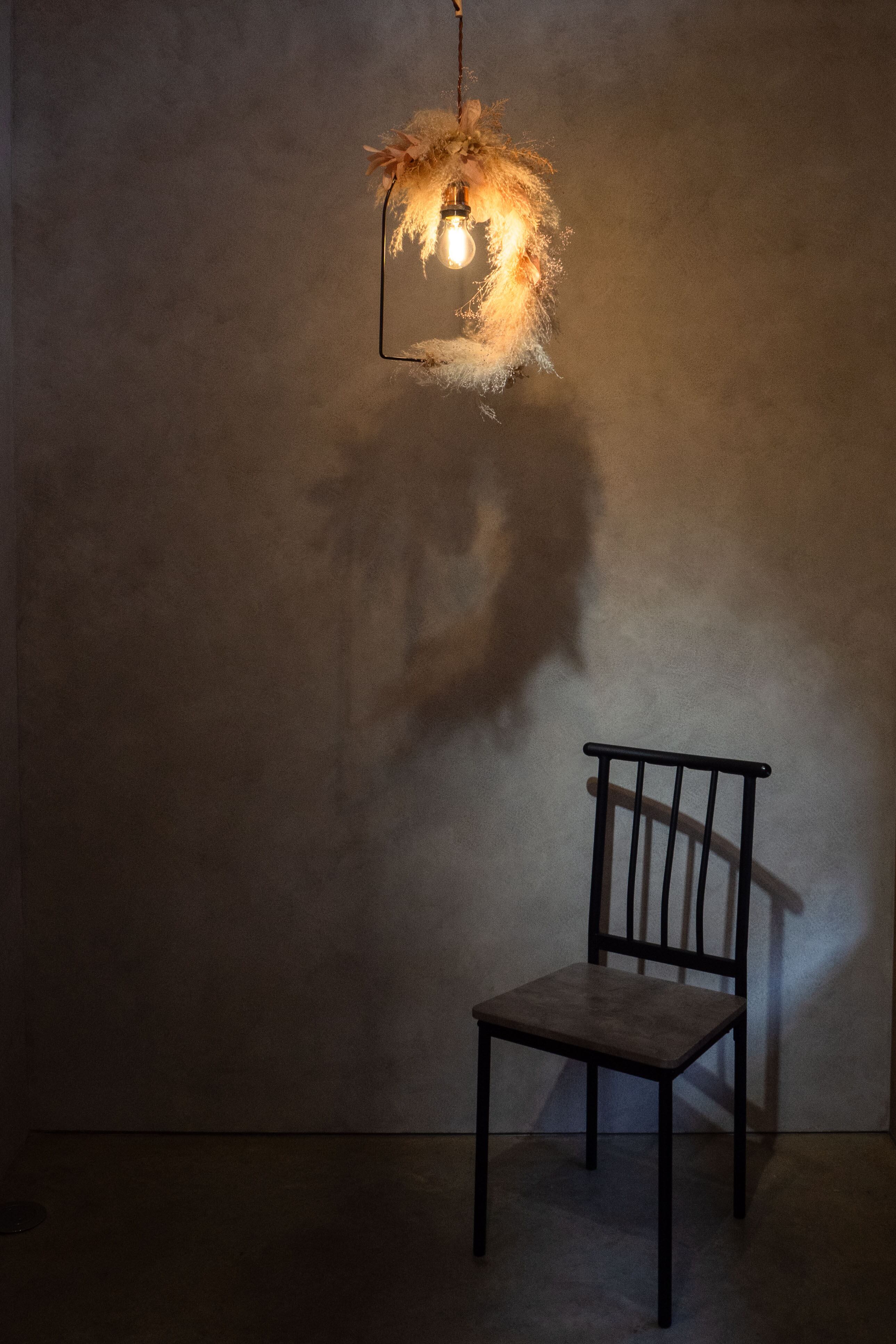 柔らかいピンクとホワイトのカラーリングのビッグテールリードがメインの吊り型ライト。アイアンフレームとふんわりとした花材が相反したデザインが目を惹きます。トップ部分にルスカスをあしらい、可愛くなりすぎない大人な印象に仕上がっています。