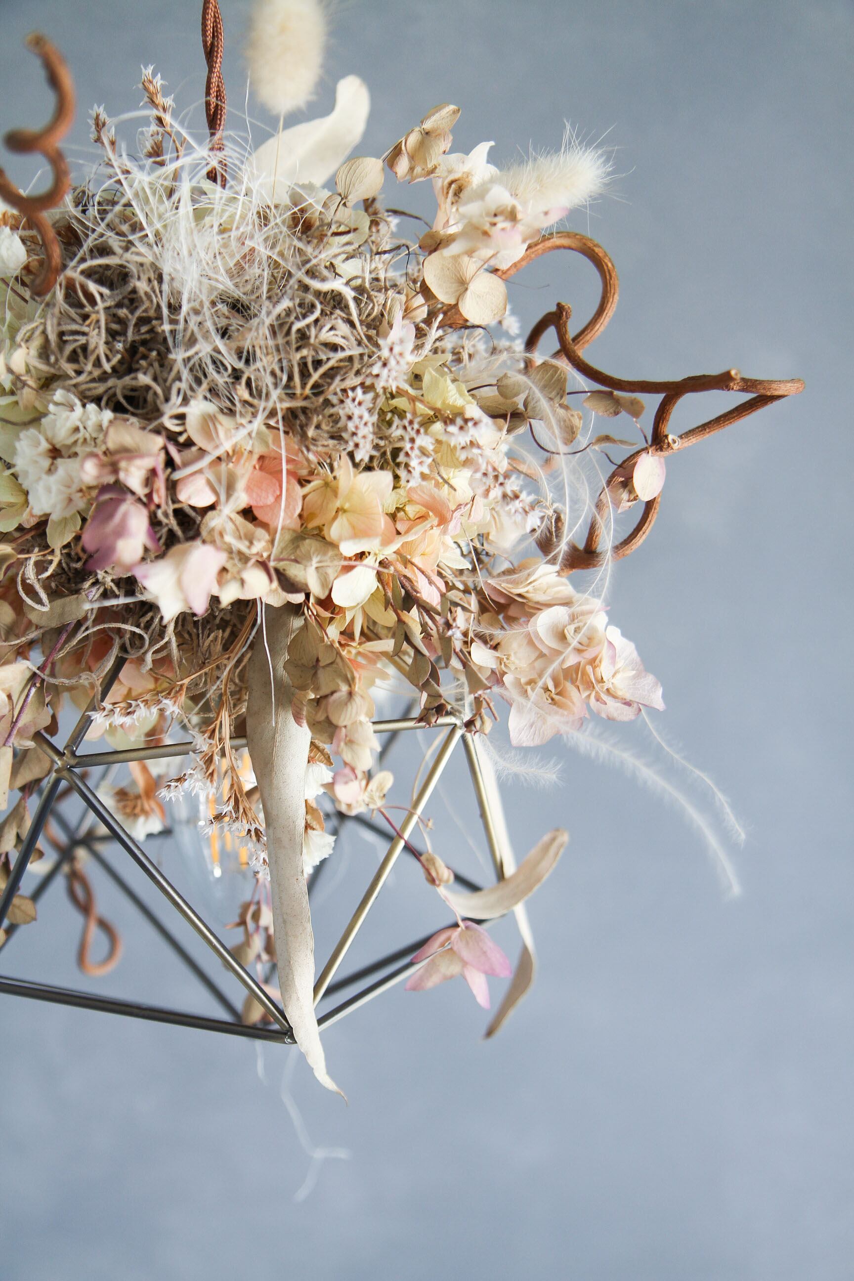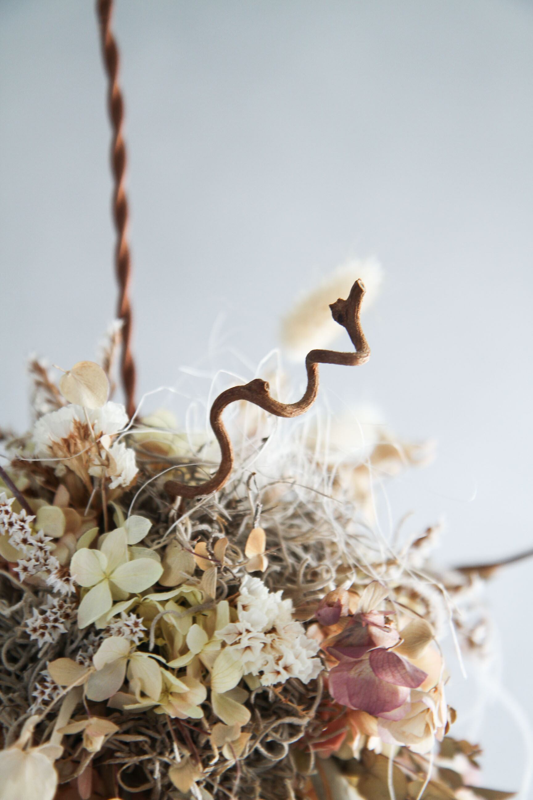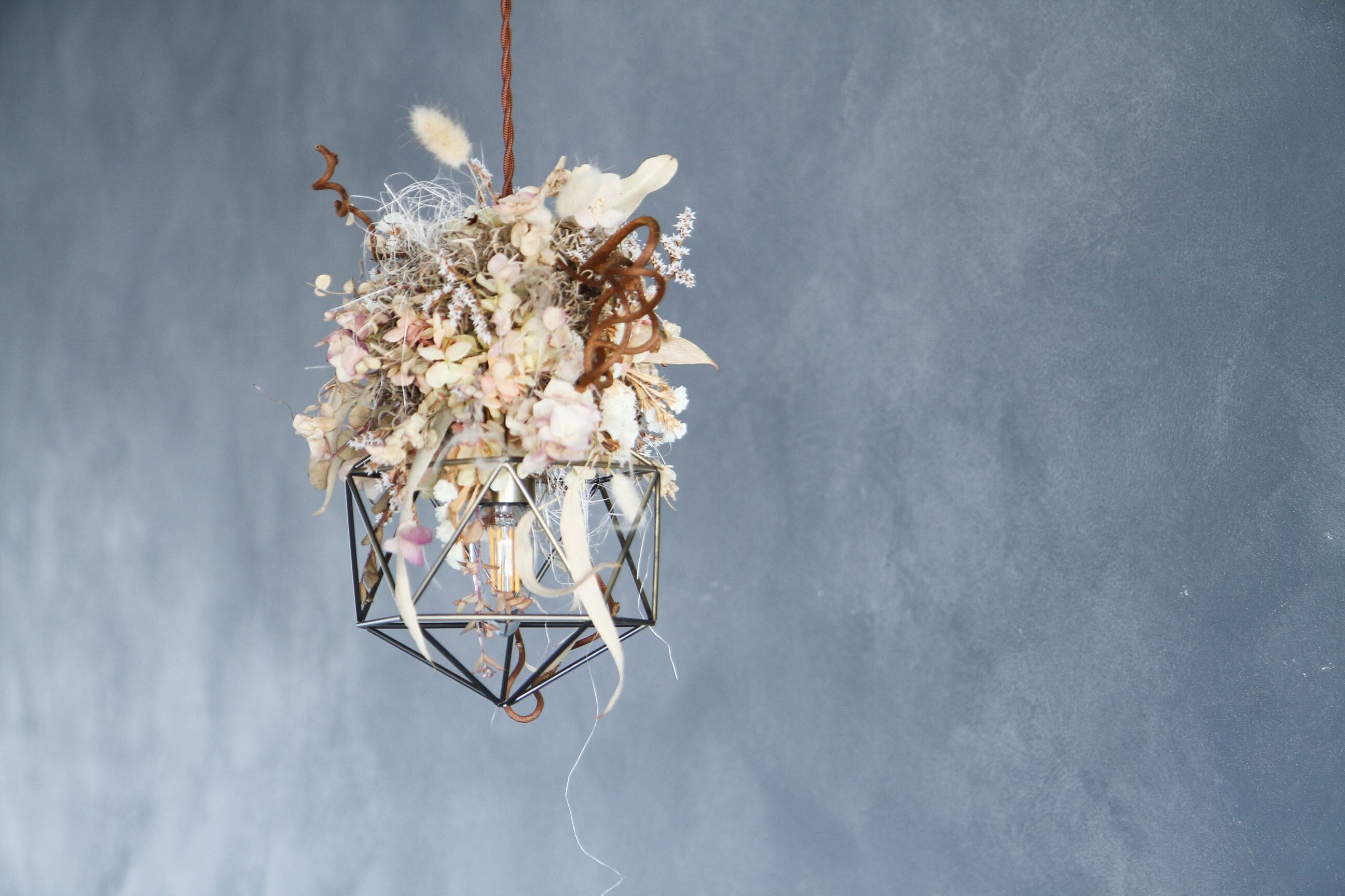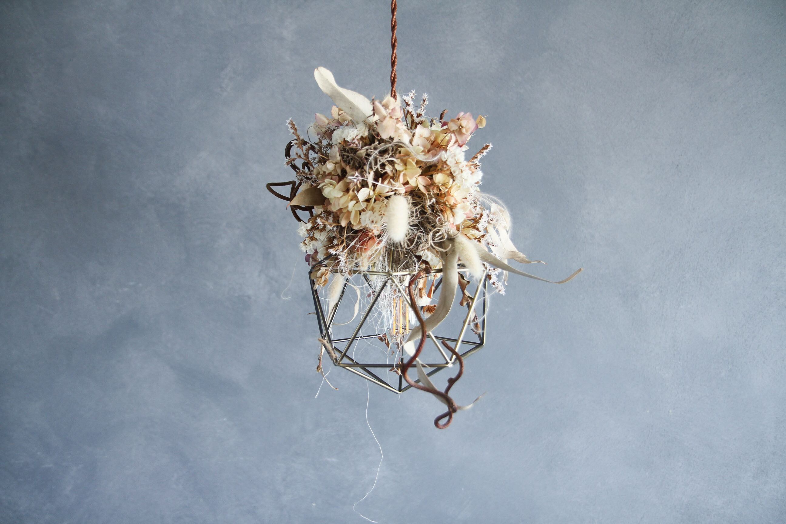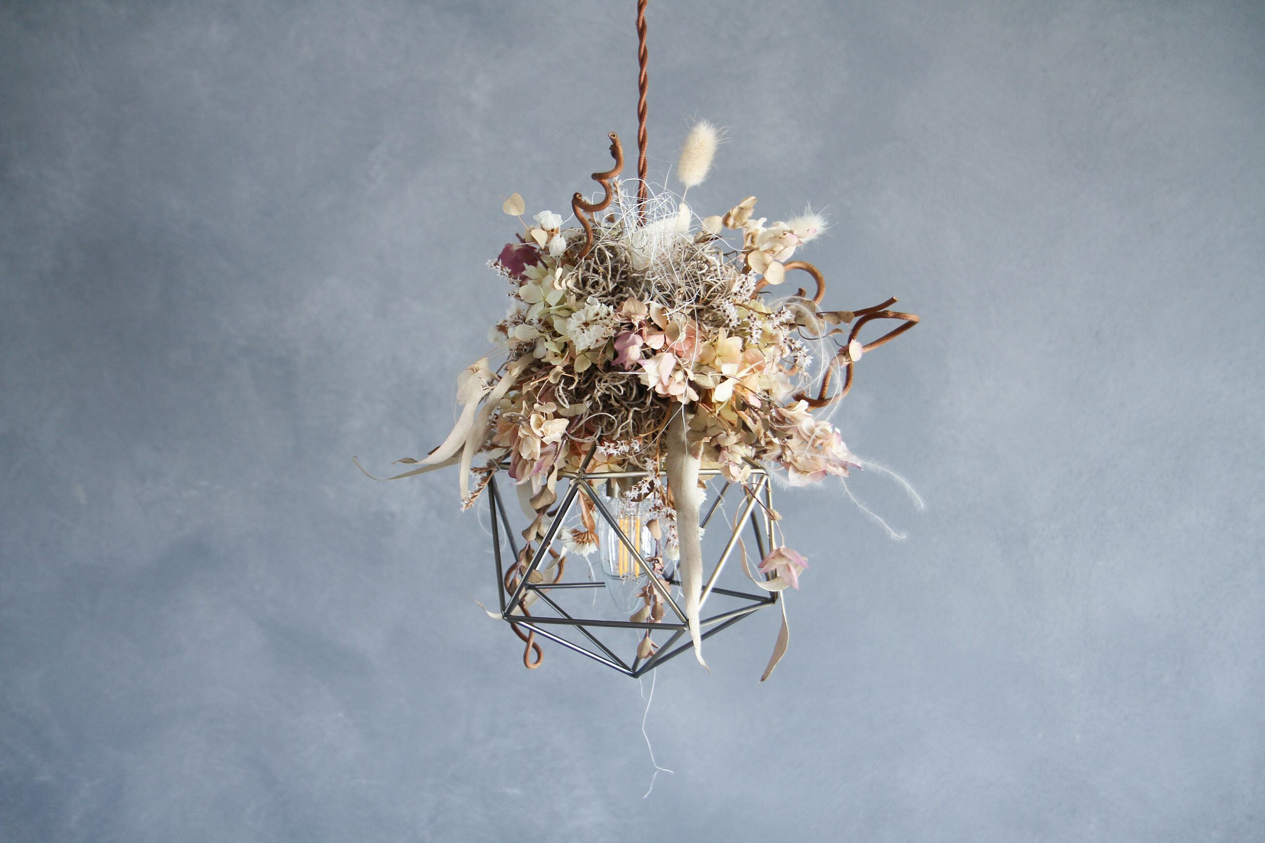直線的なフレームと相反した可愛らしいドライフラワーの組み合わせが魅力的な照明です。